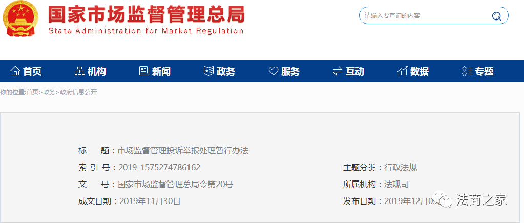 《市场监督管理投诉举报处理暂行办法》已于2019年11月26日经国家市场监督管理总局2019年第15次局务会议审议通过,现予公布,自2020年1月1日起施行。